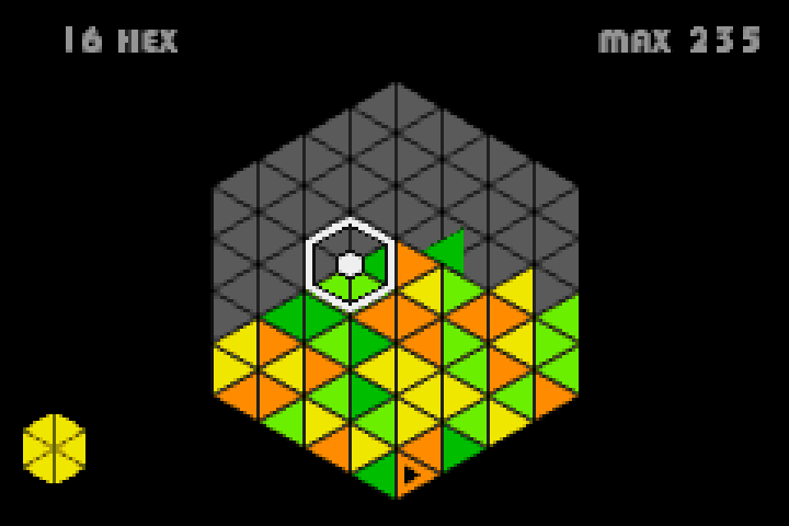 Much like in Techno BB, there’s a certain amount of complexity extracted just from moving many tiles at once. In Dialhex, these tiles are triangles embedded in a giant hexagon, and the player spins these tiles six at a time within a hexagon-shaped cursor.1 With a gravity system and less-than-intuitive position resolution thanks to the slant of the pieces, any match (made by creating a hexagon with tiles of a single color) shakes up the stack, especially as the field fills up. By hovering the cursor in empty space, gravity ceases, and the player can suspend tiles in air to drop them into the most optimal spot. Between each of these dynamics, there’s quite the foundation here for quick thinking. Matching a full hexagon without accidentally scattering it requires pairing tiles together, as each cursor position is attached to adjacent ones by a two-tile third of the hexagon. Juggling a piece across the stack can’t be done through linear button presses either, as cursor positions are staggered against both the horizontal and vertical axes. There’s quite a lot to consider in the skill floor thanks to an original, dense base idea.