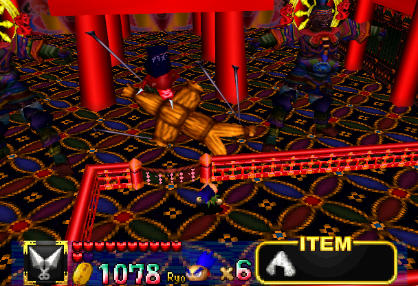 Focusing on the latter helps smooth out serviceable platforming gameplay, another place where Goemon desperately wants to remind the player of its 1997 release date. The fact that Goemon plays at all like a normal modern platformer, sans adjustable camera, is impressive, especially given the size of the areas and the inclusion of obstacles that dynamically rotate, contract, and expand. Basically no game other than Mario 64 had accomplished this by mid-1997, a few months before the release of both Croc and Crash 2. Unlike Mario 64, however, Goemon has nothing to lean on besides a single jump action. Goemon and his friends (who the player can freely switch between) have abilities that do little other than solve particular challenges, whether it be Ebisumaru shrinking to squeeze through gaps or Yae’s mermaid transformation for swimming. Late in the game Goemon gains his “Sudden Impact” ability (which gives him super saiyan-esque yellow spiked hair), but it exists only to push nondescript metal blocks, perhaps missing the point of such an upgrade.2 His hookshot, however, has more life to it, but only in the sense that it seemingly deals as much damage as any other weapon while also working from range. The other characters each take up at least one weapon slot on a basic melee weapon, and their other options lack this panache. Ebisumaru has a camera with a flash on a timer, opening up a brief opportunity for a proto-Luigi’s Mansion ghost discovery setpiece before degrading to a mere Lens of Truth for a handful of other rooms (with its necessity made explicit to the player, no less). Only Sasuke, the robot ninja, gets a high-jump rocket launch ability late in the adventure, but the game loudly buzzes if you attempt to use it in any context outside of standing idle.