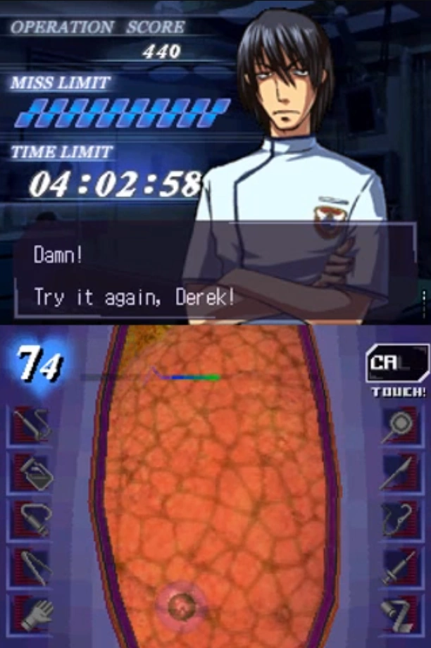 Atlus adapts the grisly world of surgery as a timer juggling exercise, with the player managing a main time limit, the drain on their patient’s vitals, and the interval until a new hazard spawns. Kyriaki, one of the game’s fabricated “GUILT” viruses, best exemplifies this. It appears by creating an incision in the patient’s tissue, which bleeds and thus increases the patient’s vital drain, and it travels under the tissue surface making more incisions until extracted. Locating one permanently requires detecting it with an ultrasound and then cutting it out of the tissue with the scalpel, after which it will make yet another incision, leaving two net additional cuts to deal with. To kill it, you target it with a laser for a period, with the caveat that leaving the laser in one place for too long will burn through the tissue and cause a hemorrhage. When multiple of these appear at once, you’re put in the uncomfortable circumstance of switching your attention between actively adversarial viruses and the injuries both you and they incur. This aligns with the game’s spatial aspect: your tools utilize stylus strokes, so the player can optionally bide their time fixing injuries while waiting for multiple Kyriaki to line up for extraction in a single strike. Attempting this without consideration of the patient’s vitals often results in a quick death, however, especially in scenarios where killing one on its own leads to two more spawning and overwhelming the organ with incisions. While this sounds like a traditional combat game, the implementation is a stranger blend: small skill-based actions, almost reminiscent of the exaggerated tasks of the Cooking Mama games, required dynamically based on the behavior of the virus.